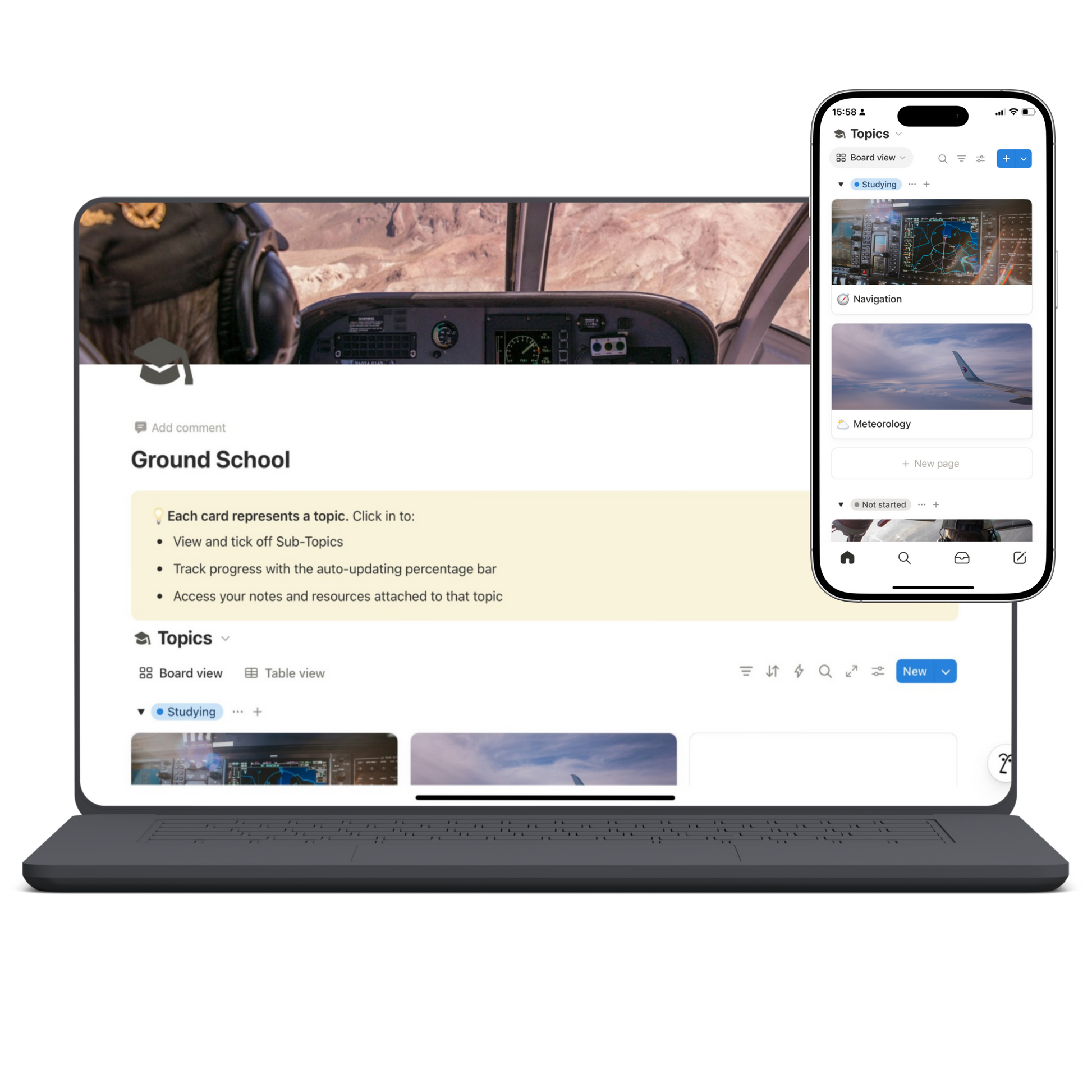 - Topics (e.g Air Law, Meteorology) - Each topic has a dynamic progress bar, a place for notes and resources, and a complete checklist of every syllabus item within the topic