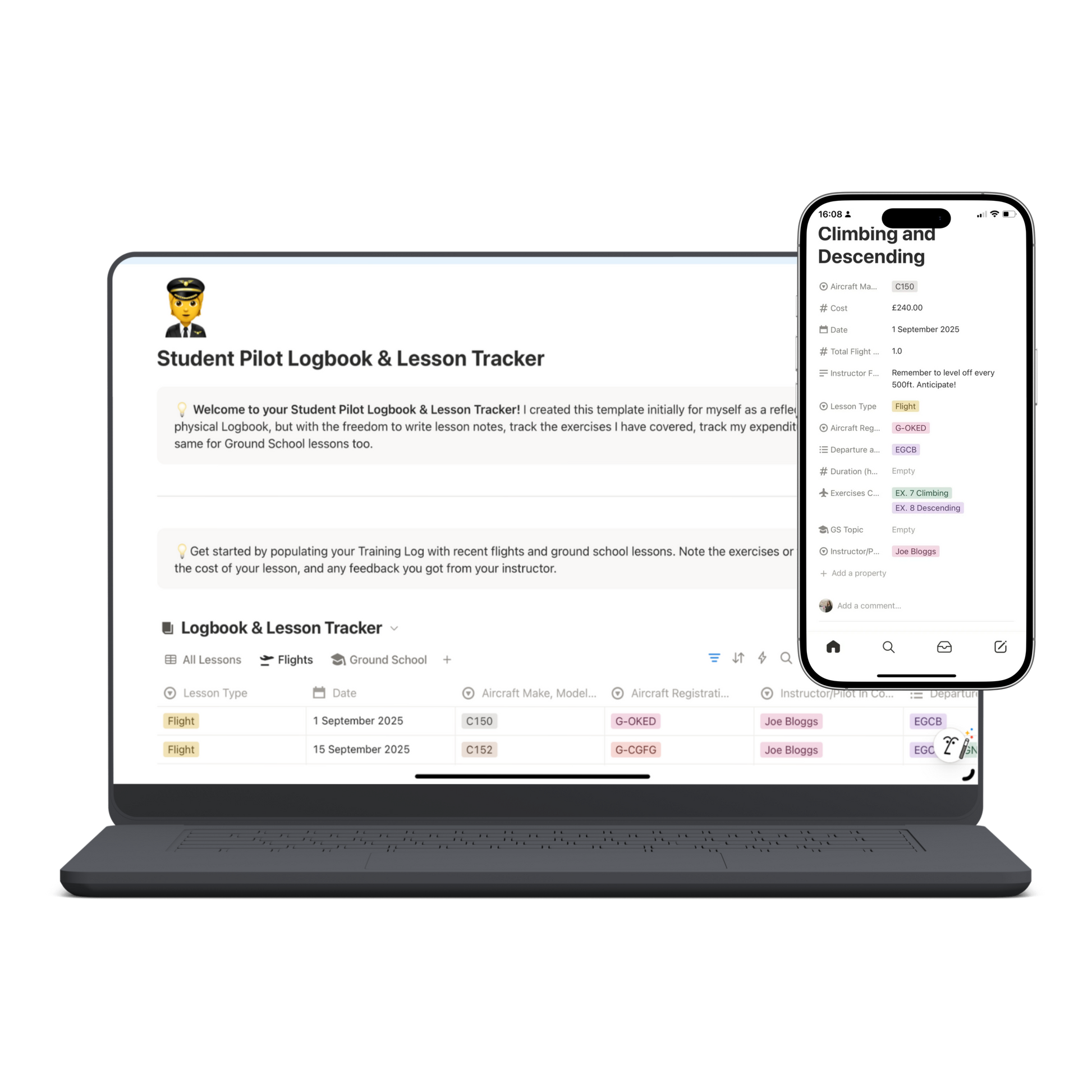 Your Student Pilot Logbook & Lesson Tracker allows you to track both flight training and ground school lessons, keep notes against lessons, note down any instructor feedback, tag them with specific exercises or topics covered, and track your expenditure. This template is complete with the latest UK Civil Aviation Authority syllabus for tagging, but can be amended to suit other jurisdictions. Get a comprehensive overview of your flight training journey.